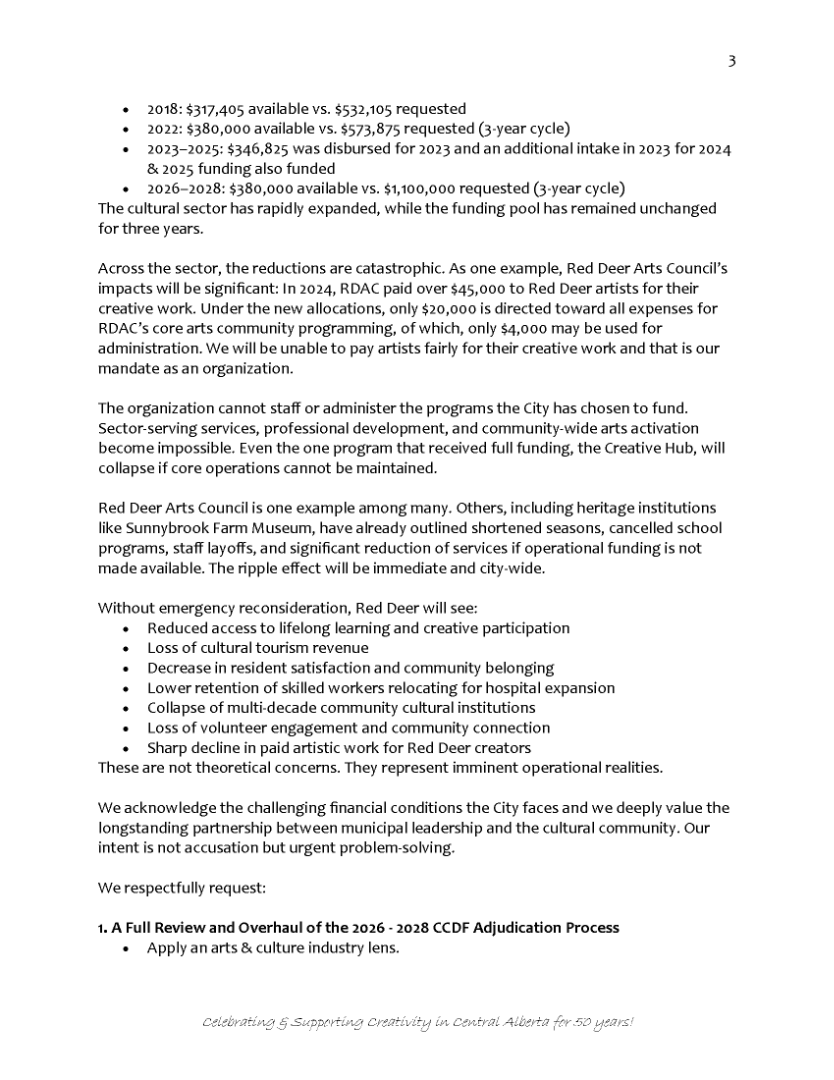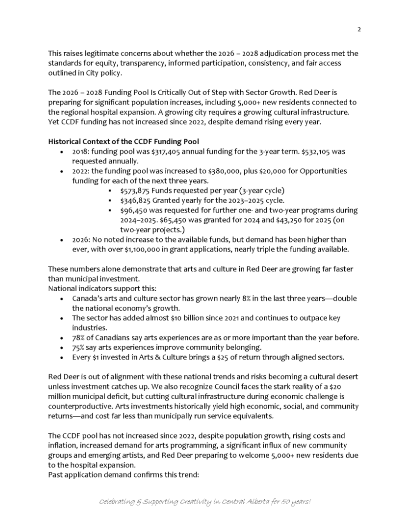I am writing as a concerned Red Deer resident to urge you to revisit the 2026 - 2028 Community Culture Development Fund (CCDF) funding allocations. Many arts, culture, and heritage organizations—some that have served our city for decades—received drastic cuts or no funding at all for the next three years.