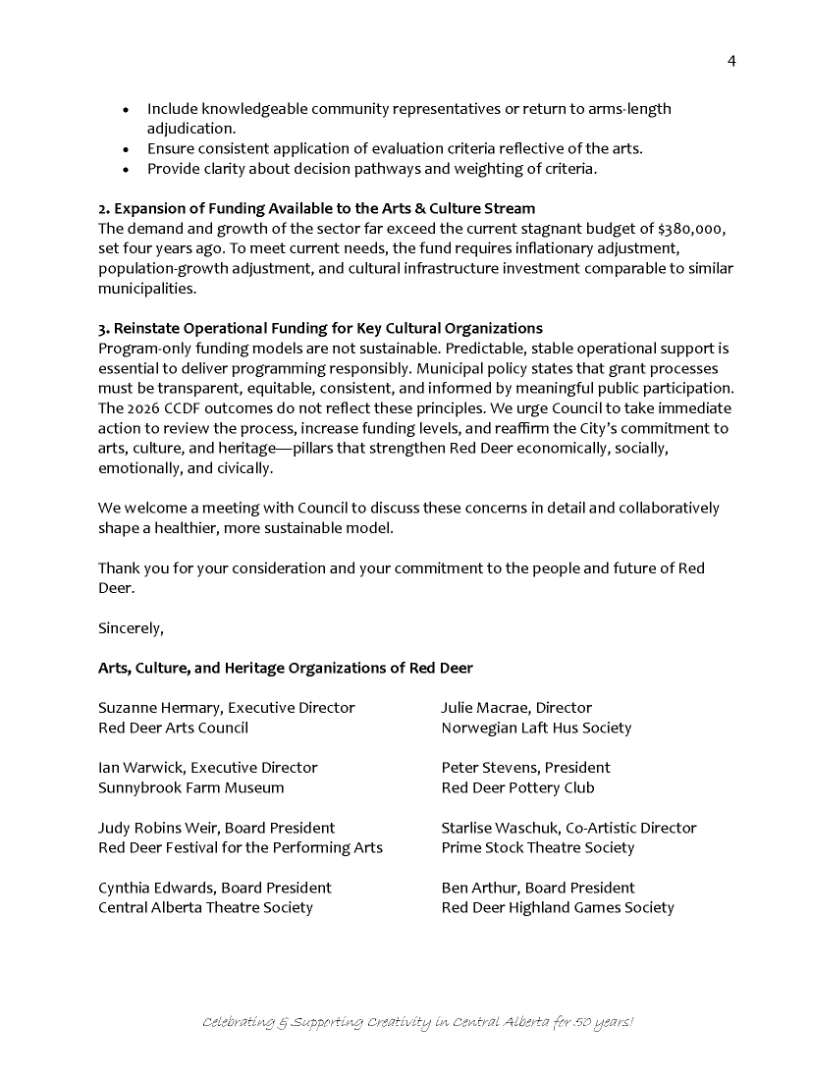 Many long-standing arts, culture, and heritage organizations in Red Deer received either significant funding reductions or no support at all, despite serving thousands of residents every year. These cuts will result in cancelled programs, layoffs, reduced seasons, fewer events, and the possible closure of organizations that have shaped our community for decades.