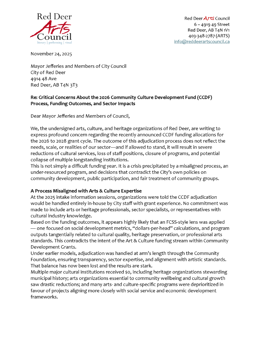 Subject: Red Deer Needs Strong Arts & Culture Support – Please Reconsider 2026-2028 CCDF Funding Decisions