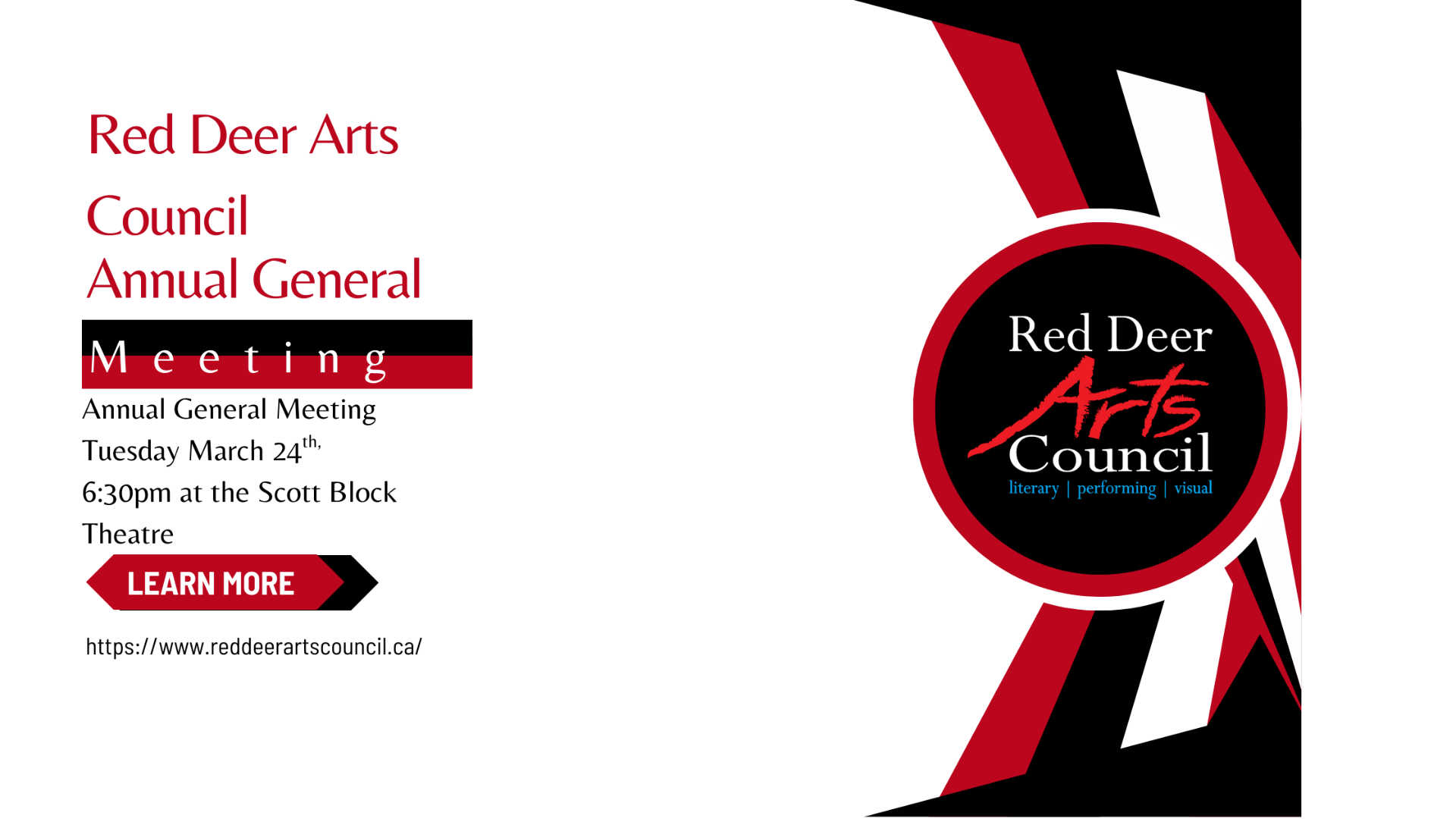 Notice is hereby given that the ANNUAL GENERAL MEETING of The Red Deer Arts Council will be held on Tuesday, March 24, 2026 at 6:30pm in The Main Stage space of The Scott Block Theatre & Event Venue at 4816 50 Avenue, Red Deer, AB T4N 4A3.